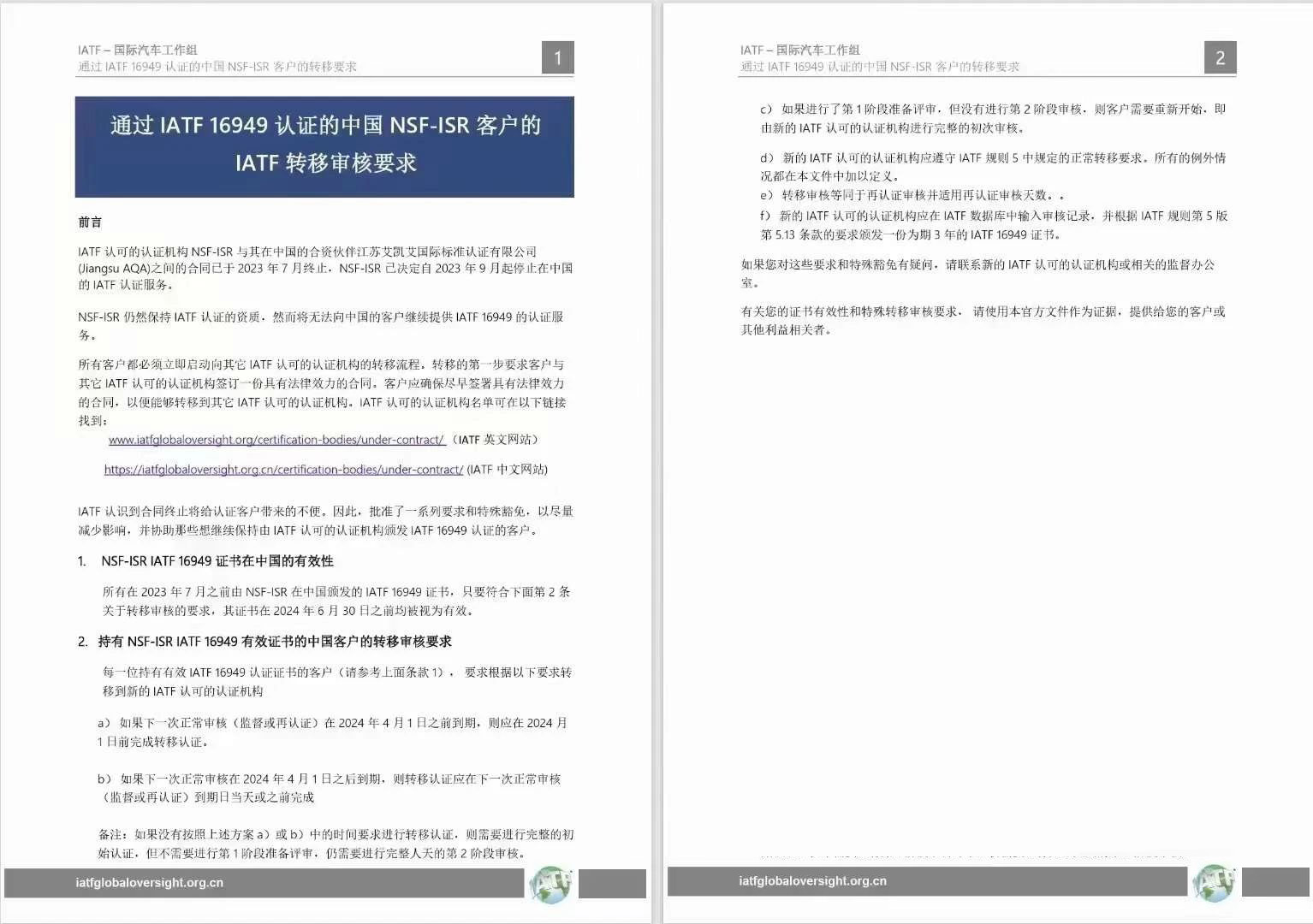 在此背景下,所有在2023年7月之前由NSF-SR在中国颁发的IATF16949证书只要符合我们即将提出的转移审核要求,其证书在2024年6月30日之前均被视为有效。