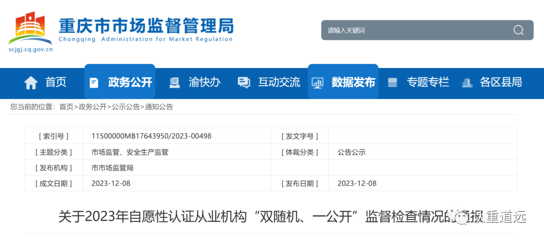 根据《中华人民共和国认证认可条例》和《市场监管总局办公厅关于开展2023年认证从业机构“双随机、一公开”检查工作的通知》(市监认证函〔2023〕83号)要求,重庆市市场监督管理局于6月至10月开展了2023年自愿性认证从业机构“双随机、一公开”监督检查。现将有关检查情况通报如下: