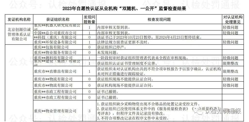 关于2023年自愿性认证从业机构“双随机、一公开”监督检查情况的通报
