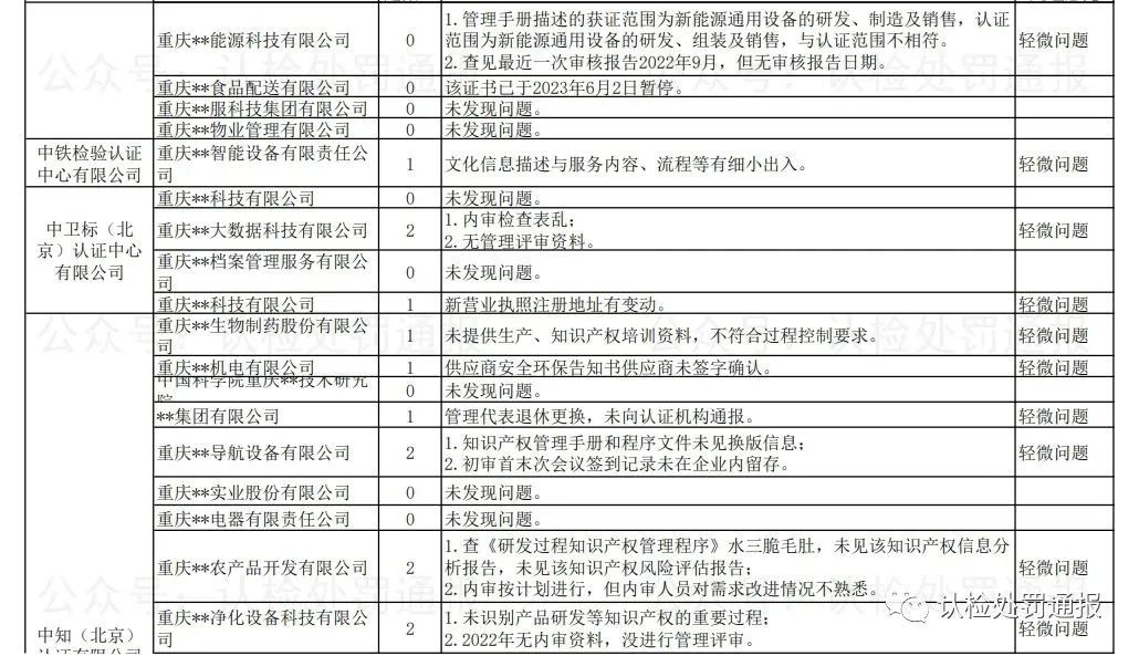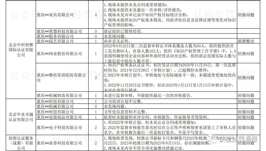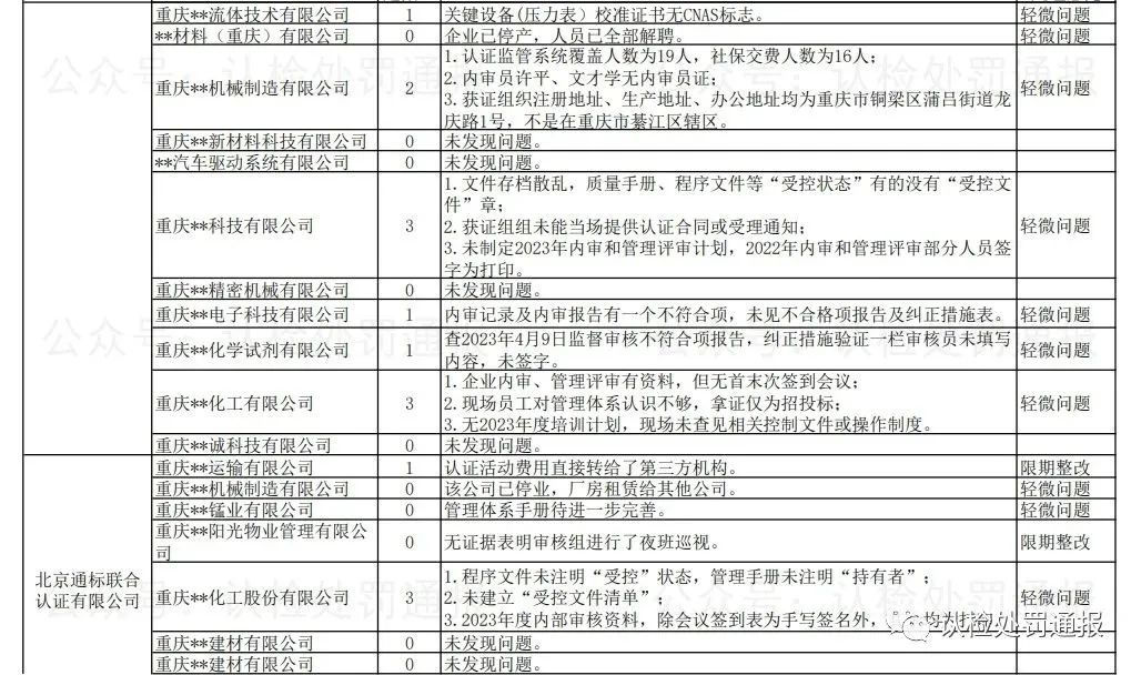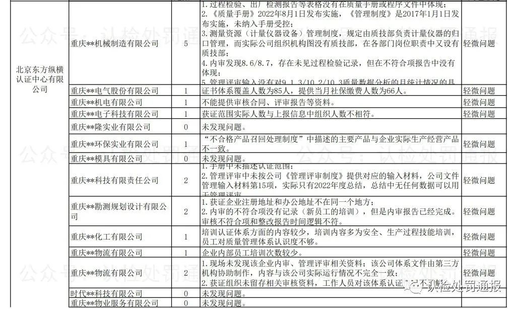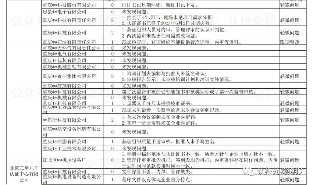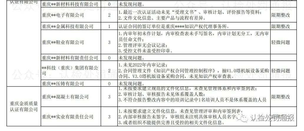 (二)获证组织存在的问题。获证组织不能提供企业内审、管理评审、认证合同、审核报告等相关资料;获证组织质量手册、程序文件由第三方机构协助制作,内容与获证组织实际运行情况不完全一致,没有“受控文件”章;内审缺少对上次内审、外审不符合项的关注;获证组织注册地址与实际运营地址不符;一些使用的仪器设备未按规定进行检定或校准;培训认证体系方面内容较少,员工对质量管理体系认识度不够。