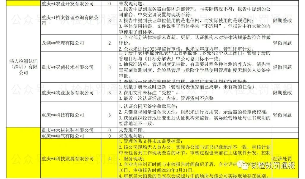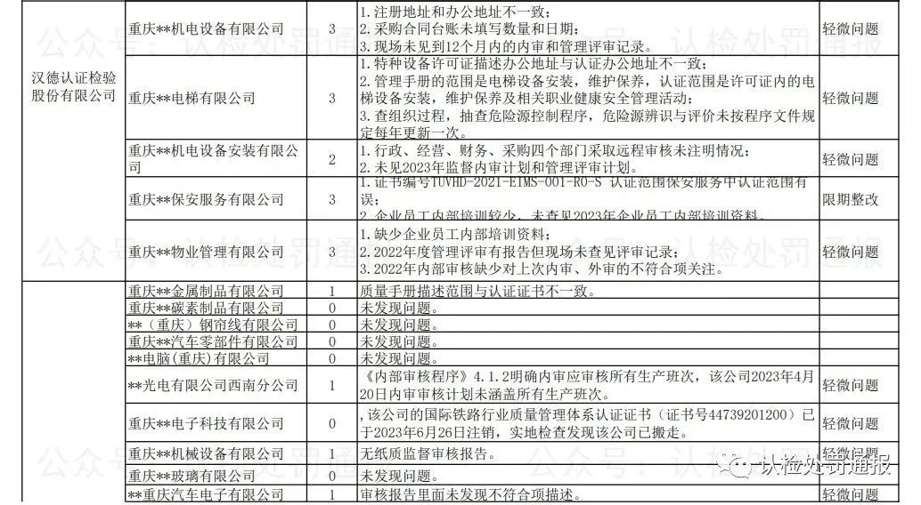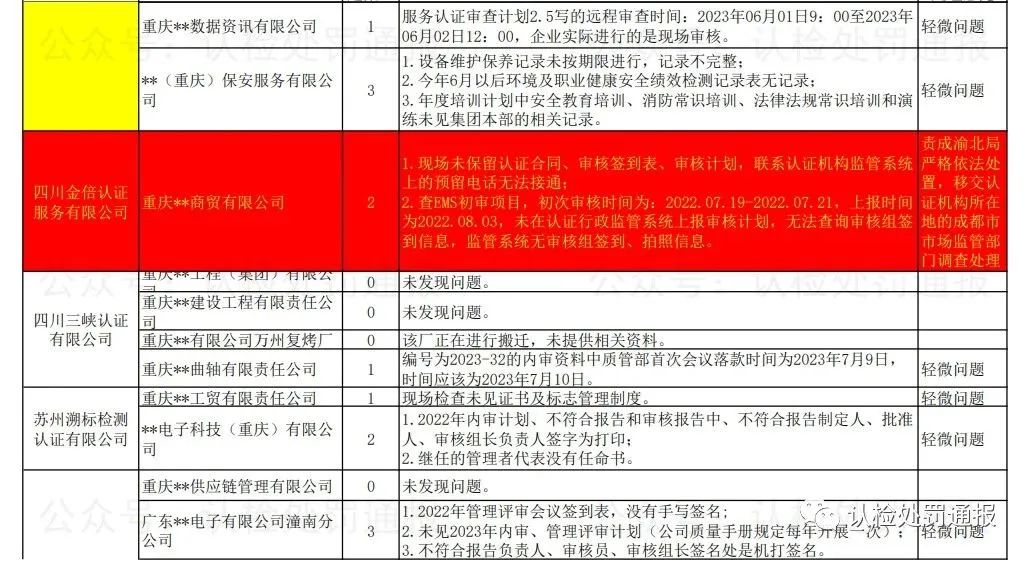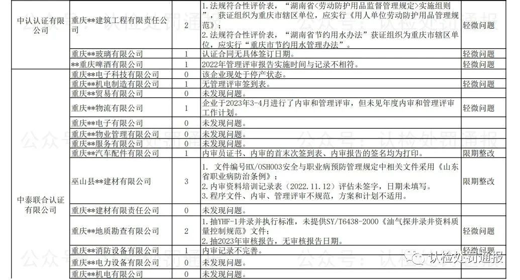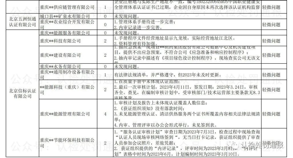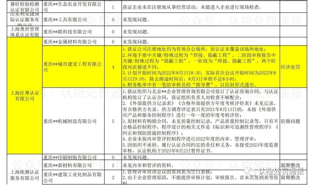 (二)获证组织存在的问题。获证组织不能提供企业内审、管理评审、认证合同、审核报告等相关资料;获证组织质量手册、程序文件由第三方机构协助制作,内容与获证组织实际运行情况不完全一致,没有“受控文件”章;内审缺少对上次内审、外审不符合项的关注;获证组织注册地址与实际运营地址不符;一些使用的仪器设备未按规定进行检定或校准;培训认证体系方面内容较少,员工对质量管理体系认识度不够。