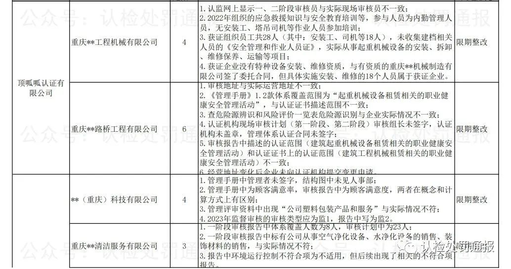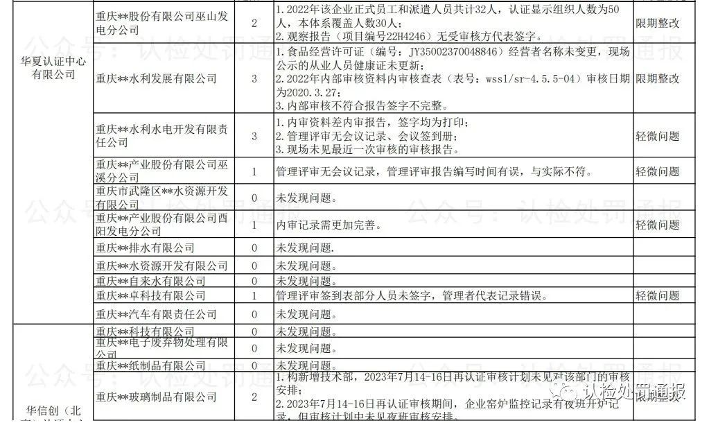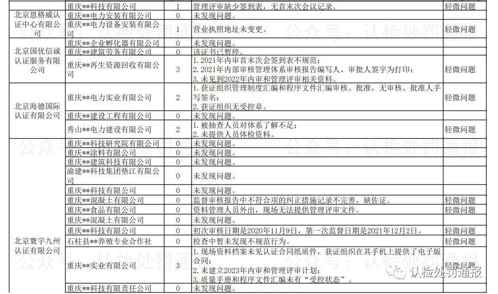 (一)认证机构方面存在的问题。遗漏认证规则规定的程序;在认证过程中未按照认证基本规范进行审核;审核计划(任务书)中审核人日数不满足要求;上报的审核计划与实际审核时间不一致;程序文件描述范围与认证证书描述范围不一致;个别机构未按期开展监督审核;个别机构认证行政监管系统显示的审核员与实际现场审核员不一致;个别审核员违规收取获证组织“指导费”;审核报告填写不规范,有的审核未提出任何需整改的问题;有的签字为电脑打印、未亲笔签名,缺少首末次会议签到表,认证流程与质量管控不到位。