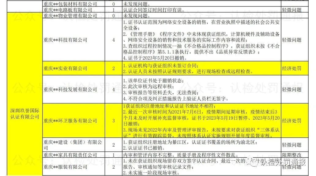 因部分获证组织停产或搬迁,实际现场检查343家获证组织,42个区县局累计出动检查人员750人次,检查发现问题375个,经济处罚5家认证机构(涉及7家获证组织),杭州万泰认证有限公司、华鉴国际认证有限公司、科汇认证(江苏)有限公司、上海臣尊认证有限公司、深圳玖誉国际认证有限公司涉嫌存在遗漏认证规则规定的程序等行为被立案调查。