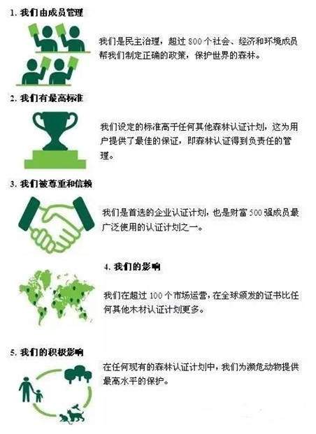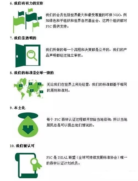 根据FSC的“森林管理10大原则”,森林经过严格检验和认证。这些检查由独立组织进行,例如由FSC认可的土壤协会。为了获得FSC认证,森林必须以环境适宜,有益社会和经济上可行的方式管理。这就是FSC系统的独特之处,并确保森林从保护当地居民的权利到砍伐树木的方法得到良好管理。符合这些严格标准的森林获得FSC认证,木材允许携带FSC标签。
