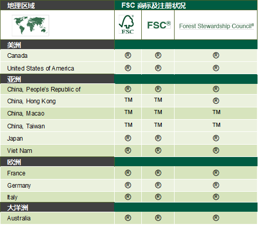 上图例举了一些国家地区中FSC商标的注册状况,FSC在中国大陆是注册商标,而在中国香港地区并未进行商标注册。