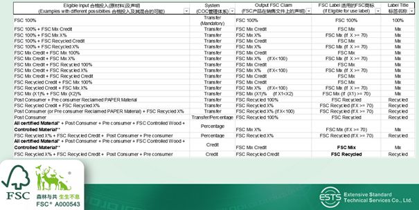 例子2:同样生产笔记本,笔记本的外面的纸板是FSC Mix Credit, 里面的书写纸是FSC Recycled Credit, 那么我们根据上表中的公式 FSC Mix Credit + FSC Recycled Credit = FSC Mix Credit, 所以产品的声明为FSC Mix Credit,应使用MIX的标签。