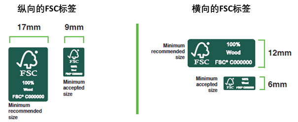 在产品上使用的FSC标签有两种格式:纵向 和 横向。标签的大小也会根据格式的不同有相应的要求,两种格式的最小尺寸为: